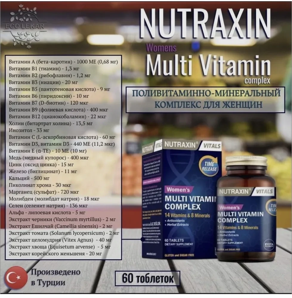 | Состав | Витамин А (бета-каротин), Витамин B1 (мононитрат тиамина); Витамин B2 (рибофлавин), Витамин B3 (ниацинамид); Витамин B5 (пантотеновая кислота), Витамин B6 (пиридоксин); Витамин B7 (D-биотин), Витамин B9 (фолиевая кислота); Витамин B12 (метилкобаламин), Холин (холина битартрат); Инозитол, Витамин С (L-аскорбиновая кислота), Витамин D3; Витамин Е, Медь (сульфат), Цинк (сульфат), Железо (бисглицинат); Кальций (карбонат), Хром (пиколинат), Марганец (сульфат); Молибден (молибдат натрия), Селен (L-селенометионин), Альфа-липоевая кислота; Ресвератрол, Экстракт черники (Vaccinum myrtillus); Экстракт зеленого чая (Camellia sinensis), Экстракт помидора (Solanum lycopersicum); Экстракт Витекса (Vitex Agnus), Экстракт корейского женьшеня (Panax ginseng); Экстракт корейского женьшеня (Panax ginseng), Экстракт хвоща полевого (Equisetum arvense); Микрокристаллическая целлюлоза, цитрат кальция; поливиниловый спирт, тальк, моно- и диглицериды жирных кислот; полиоксиэтиленсорбитанмоноолеат, поливинилпирролидон; оксид магния, сшитая натриевая карбоксиметилцеллюлоза; магниевые соли жирных кислот |