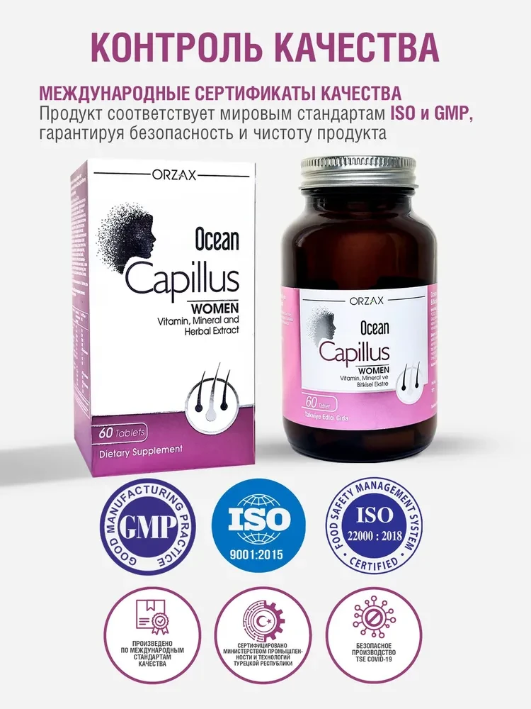 Комплекс витаминов для роста волос ORZAX OCEAN CAPILLUS WOMEN 60 таблеток разработан специально для женщин и является эффективным решением для стимуляции роста и укрепления волос. Эта добавка помогает улучшить состояние волос и предотвращает их выпадение. Формула содержит тщательно подобранный комплекс витаминов и минералов, необходимых для оптимального роста, и разработана с учетом высокой усвояемости организмом.