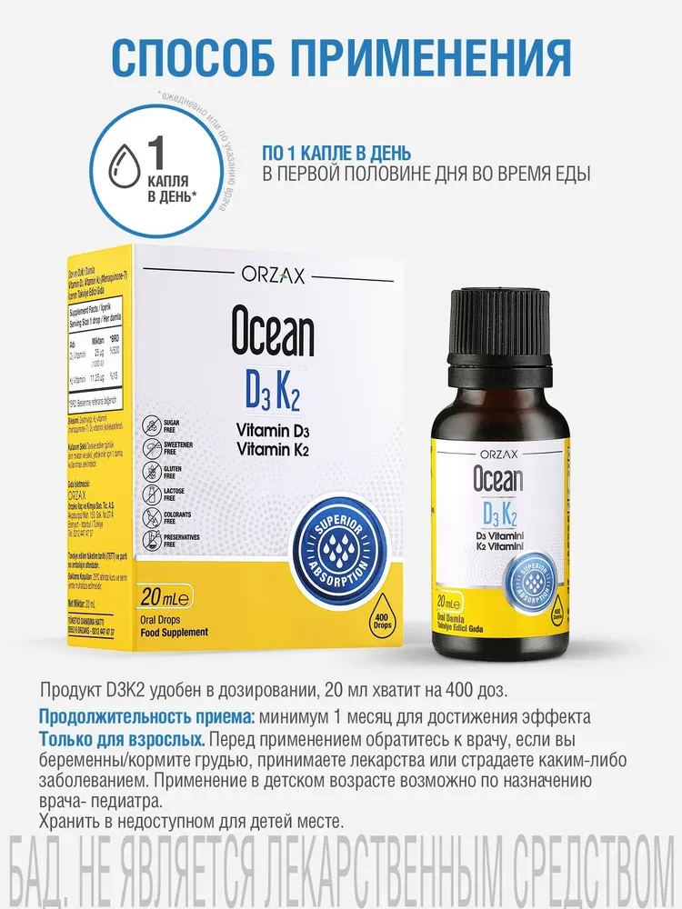 | Комплектация | флакон 20 мл с Витамином Д3К2; пипетка |