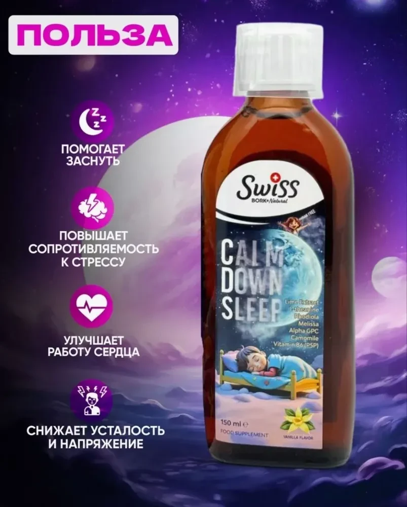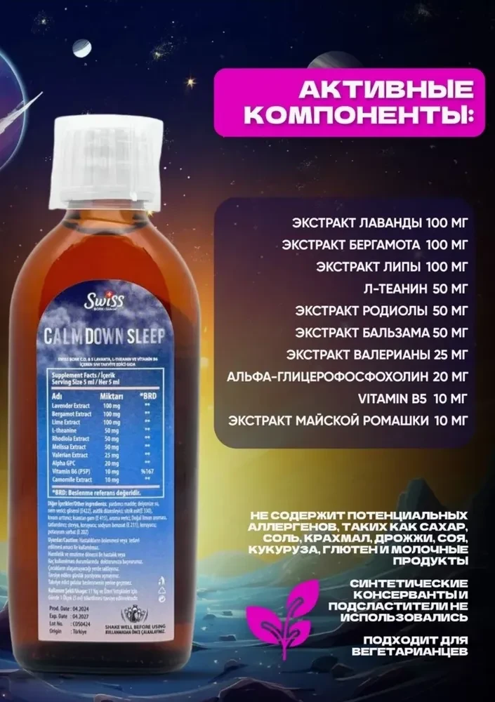 Swiss Calm Down Sleep. Сироп 150 мл. Общее действие на организм: Этот сироп, содержащий комплекс натуральных экстрактов и полезных веществ, оказывает комплексное положительное воздействие на организм: - Снижение стресса и тревожности: Комбинация экстрактов лаванды, мелиссы, валерианы и ромашки помогает успокоить нервную систему, снижает уровень тревожности и улучшает качество сна. - Улучшение настроения: Экстракты бергамота и лайма, а также витамин B6 способствуют улучшению настроения и эмоционального состояния. - Повышение когнитивных функций: Альфа-GPC и L-теанин улучшают память, концентрацию и общие когнитивные способности. Экстракт Лаванды обладает успокаивающим и расслабляющим эффектом, помогает при стрессе и тревоге, улучшает качество сна. Его используется для снижения нервного напряжения и улучшения сна. Экстракт Бергамота имеет антисептические и антидепрессивные свойства, улучшает настроение и помогает бороться с тревогой. Снимает стресс и улучшает общее самочувствие.