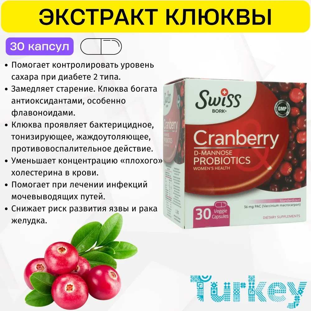 Swiss Bork Cranberry Probiotics Частые болезни, прием антибиотиков, стрессы, переедание и другие стресс-факторы оказывают существенное влияние на организм. Одним из уязвимых участков выступает желудочно-кишечный тракт, где происходит нарушение нормальной микрофлоры. Как результат — появление запора или диареи, проблемы с пищеварением и т.д. Со временем микрофлора восстанавливается самостоятельно, однако это сопровождается неприятными ощущениями и иными неприятностями. Быстрому восстановлению микрофлоры можно поспособствовать принимая биодобавку Swiss Bork Cranberry Probiotics. Описание Особенности биодобавки Swiss Bork Cranberry Probiotics В состав добавки Swiss Bork Cranberry Probiotics входит ряд полезных компонентов, которые способствуют быстрому восстановлению организма: Ацидофильные лактобактерии. Отвечают за укрепление иммунитета, способствуют улучшению синтезу витаминов группы B и K. Способствуют лучшему усвоению молочной продукции, обеспечивая расщепление лактозы и эффективному усвоению кальция. Лактобактерии рамнозус. Это представители естественной флоры кишечника. Восстановление ее количества позволяет облегчить симптомы СРК, способствуют облегчению диареи, укреплению общего здоровья кишечника. Витамин C. Позволяет укрепить иммунитет, а также создает защиту от влияния вирусов и бактерий. Способствует синтезу ряда гормонов, позволяет нормализовать проницаемость капилляров, задействован в синтезе коллагена. Клюква. Содержит большое количество витамина C, что делает ее эффективным профилактическим средством, способствует укреплению иммунитета. Добавка предназначена исключительно для приема взрослыми — от 18 лет. Суточная дозировка — одна капсула, которую необходимо запить небольшим количеством воды. Открытую упаковку необходимо хранить в прохладном, темном месте, недоступном для детей. Товар не является лекарственных средством.