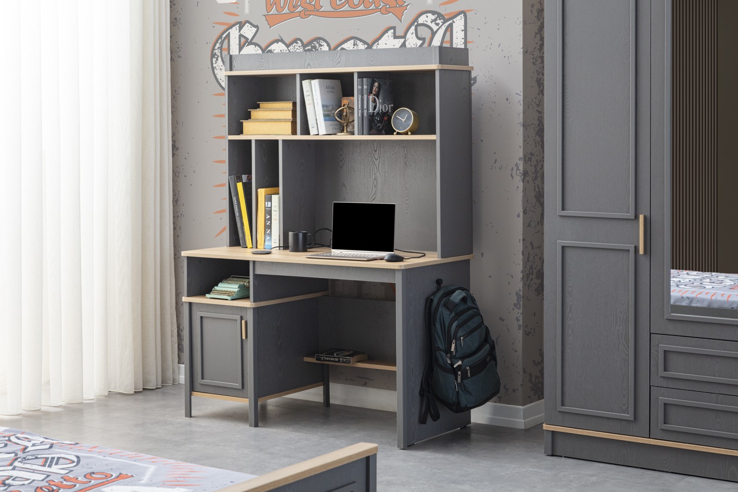 Письменный стол с надстройкой и полками для книг и учебных принадлежностей — всё под рукой для занятий и хобби.