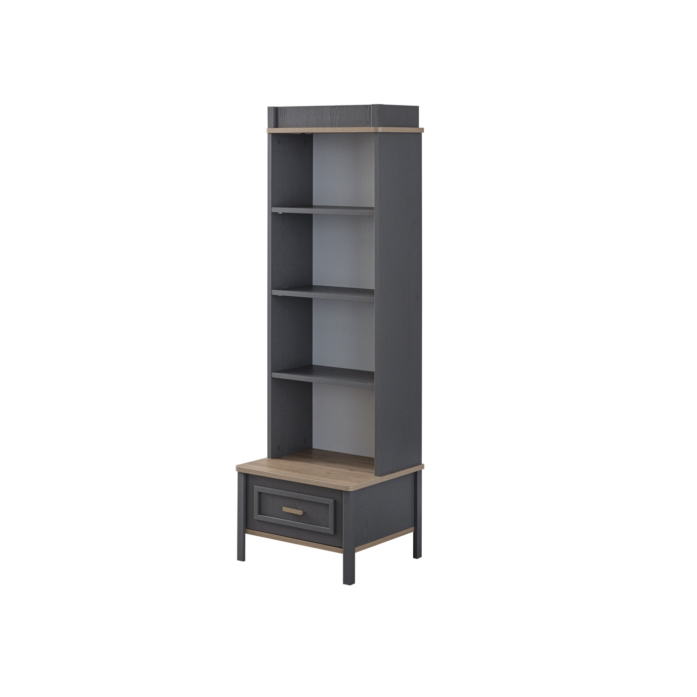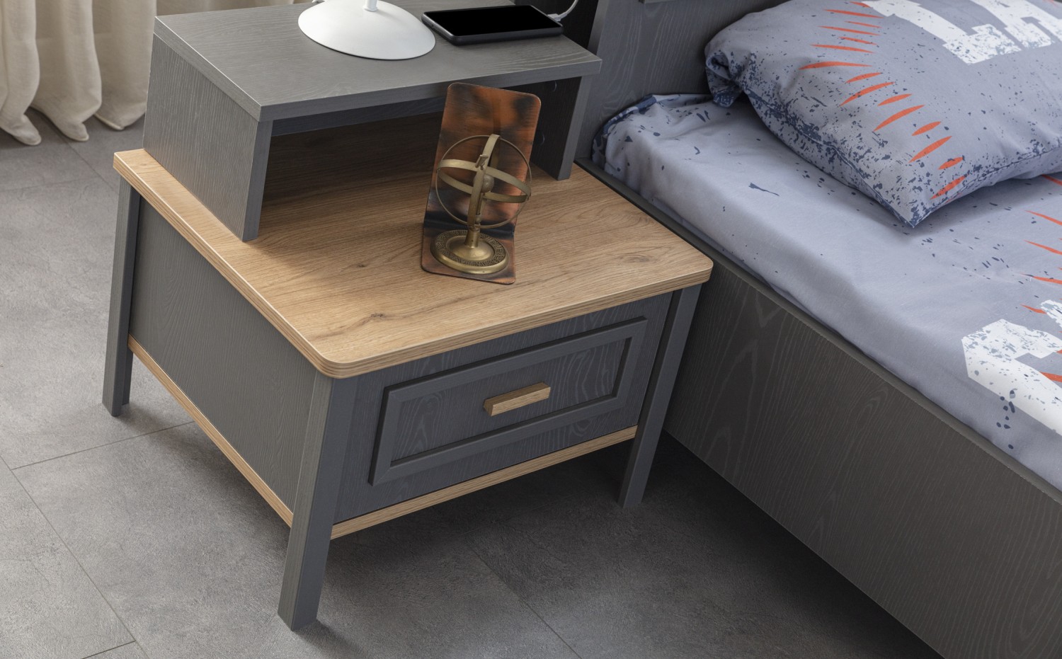 Современный и функциональный комплект мебели в стильном серо-графитовом цвете с декоративными деревянными акцентами. Набор включает: