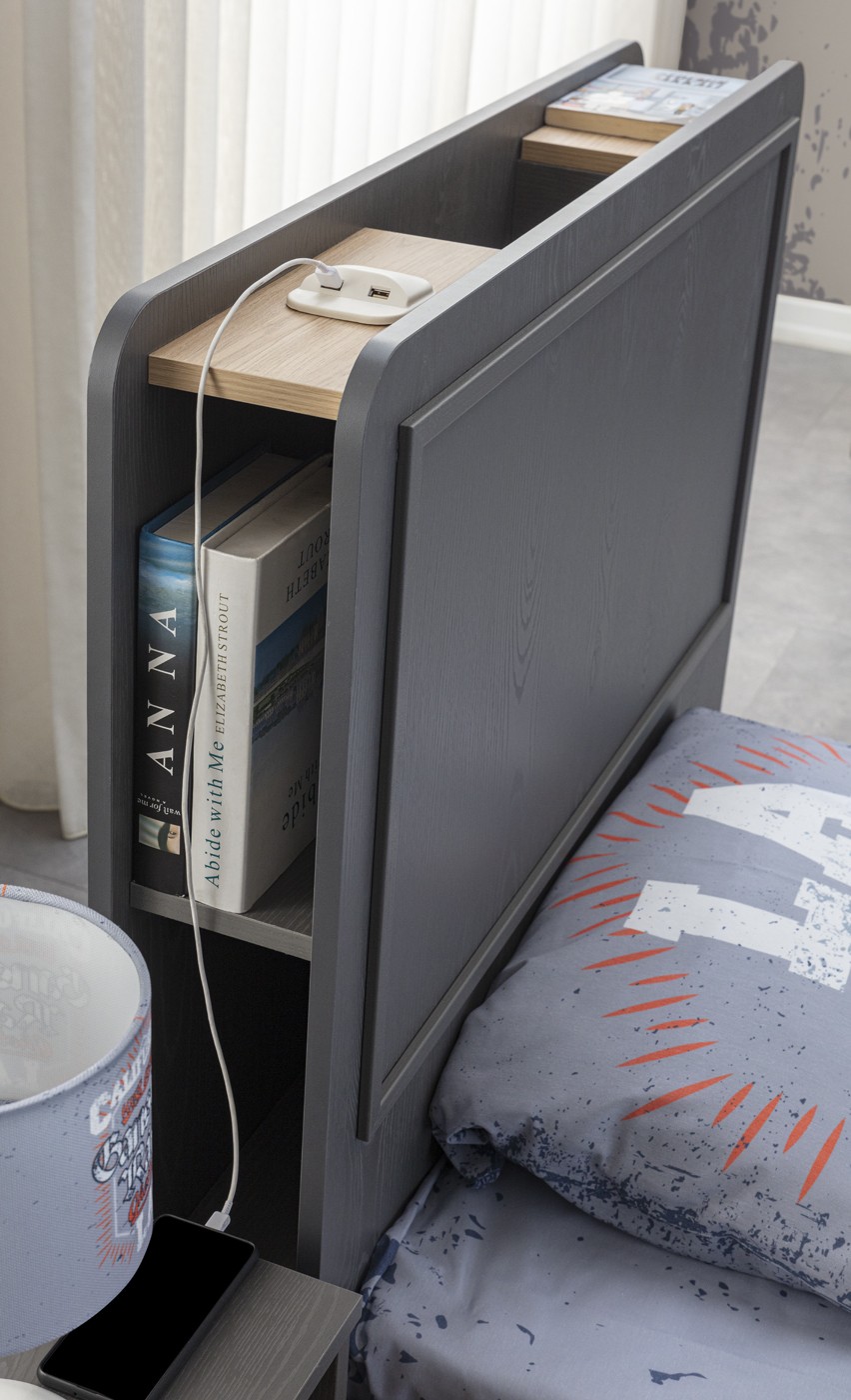 Кровать с высоким изголовьем, выполненным в лаконичном стиле, идеально подходит для подростков.