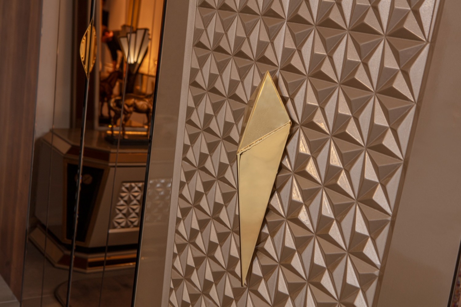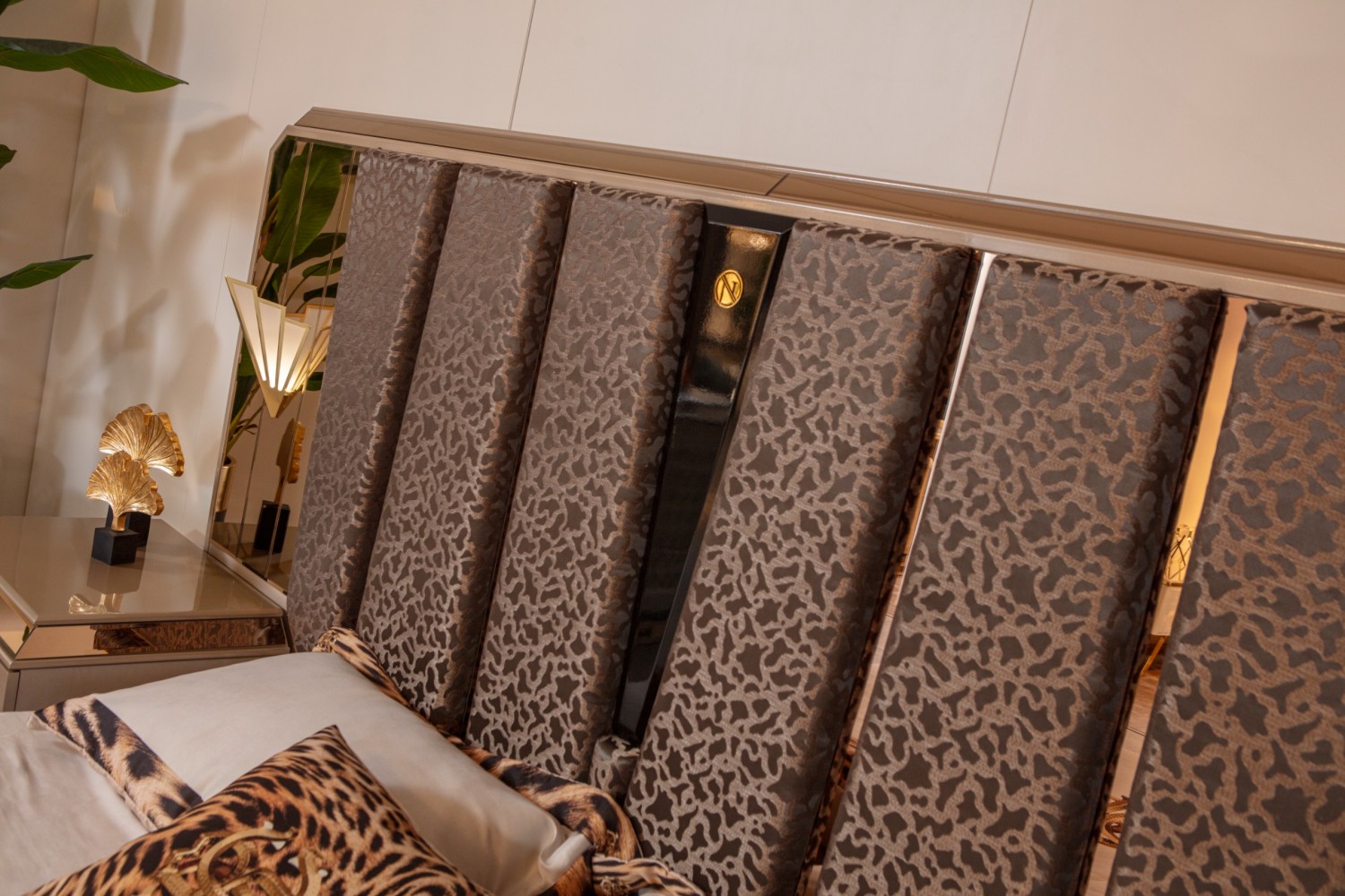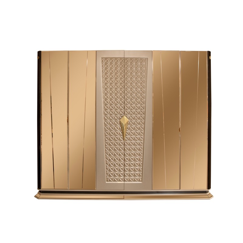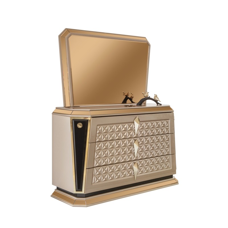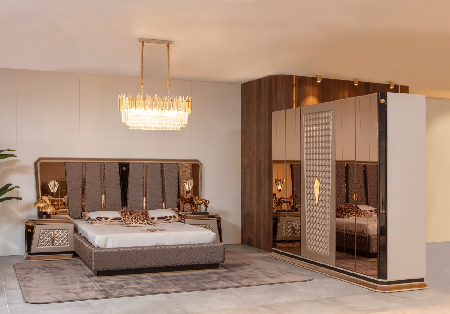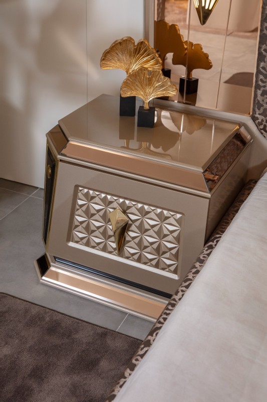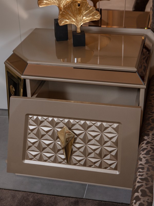 Элегантный спальный гарнитур премиум-класса, выполненный в современном стиле с элементами роскоши. В комплект входит просторная двуспальная кровать с высоким мягким изголовьем, две прикроватные тумбы с декоративными вставками и вместительный шкаф с зеркальными фасадами и объёмным рельефным узором. Металлизированные элементы и золотая фурнитура придают особый шарм и создают атмосферу уюта и статуса.