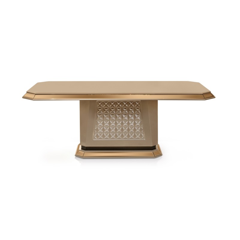 Элегантная столовая зона в современном стиле, сочетающая утончённый дизайн и премиальные материалы. Центральное место занимает большой обеденный стол с зеркальной столешницей и массивной декоративной ножкой с рельефным узором. Стулья выполнены с мягкой обивкой и позолоченными металлическими элементами, что добавляет интерьеру роскоши и комфорта.