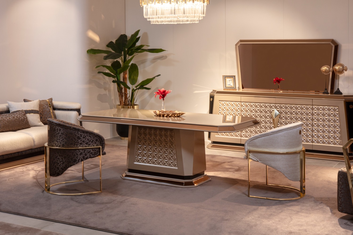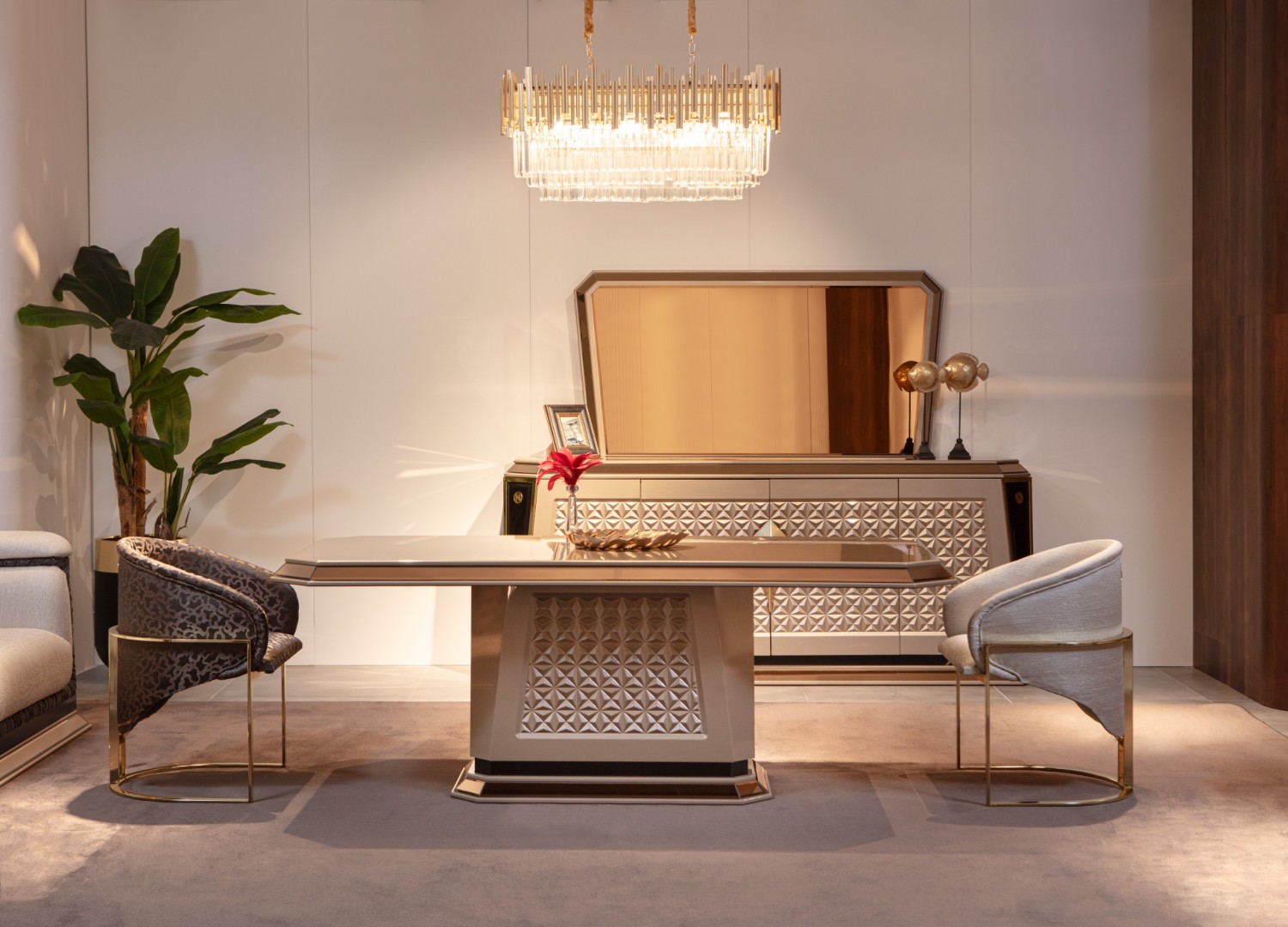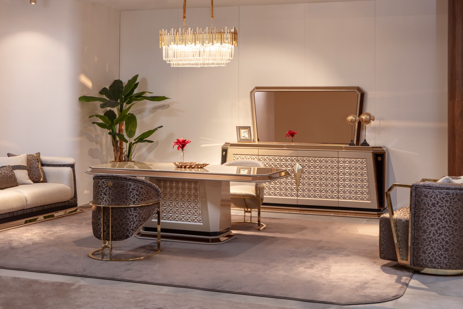Комплект дополняет вместительная консоль с зеркалом, украшенная геометрическим 3D-декором и золотыми акцентами. Такой набор создаёт атмосферу уюта и статуса, идеально подходя для приёма гостей и семейных ужинов.