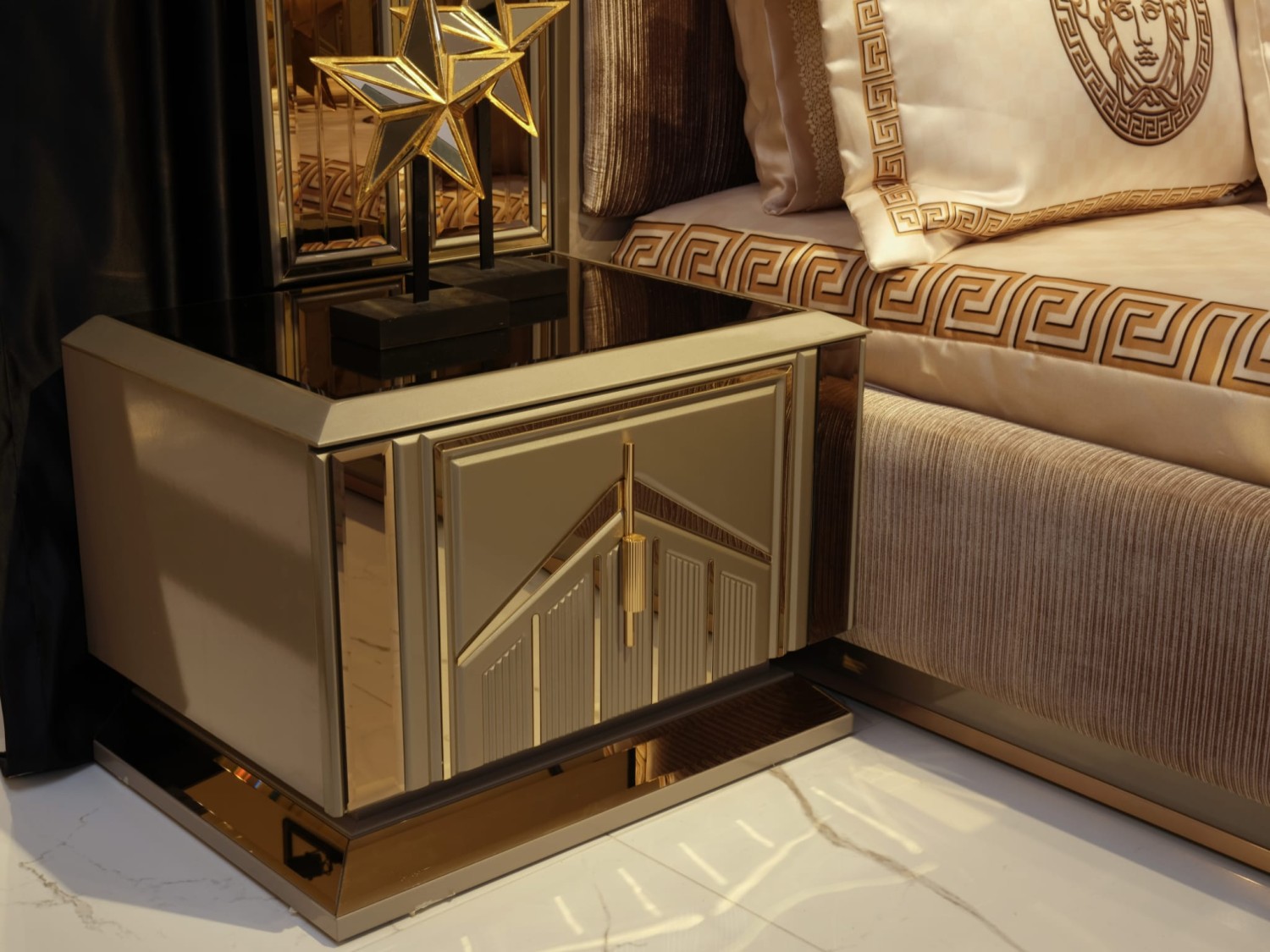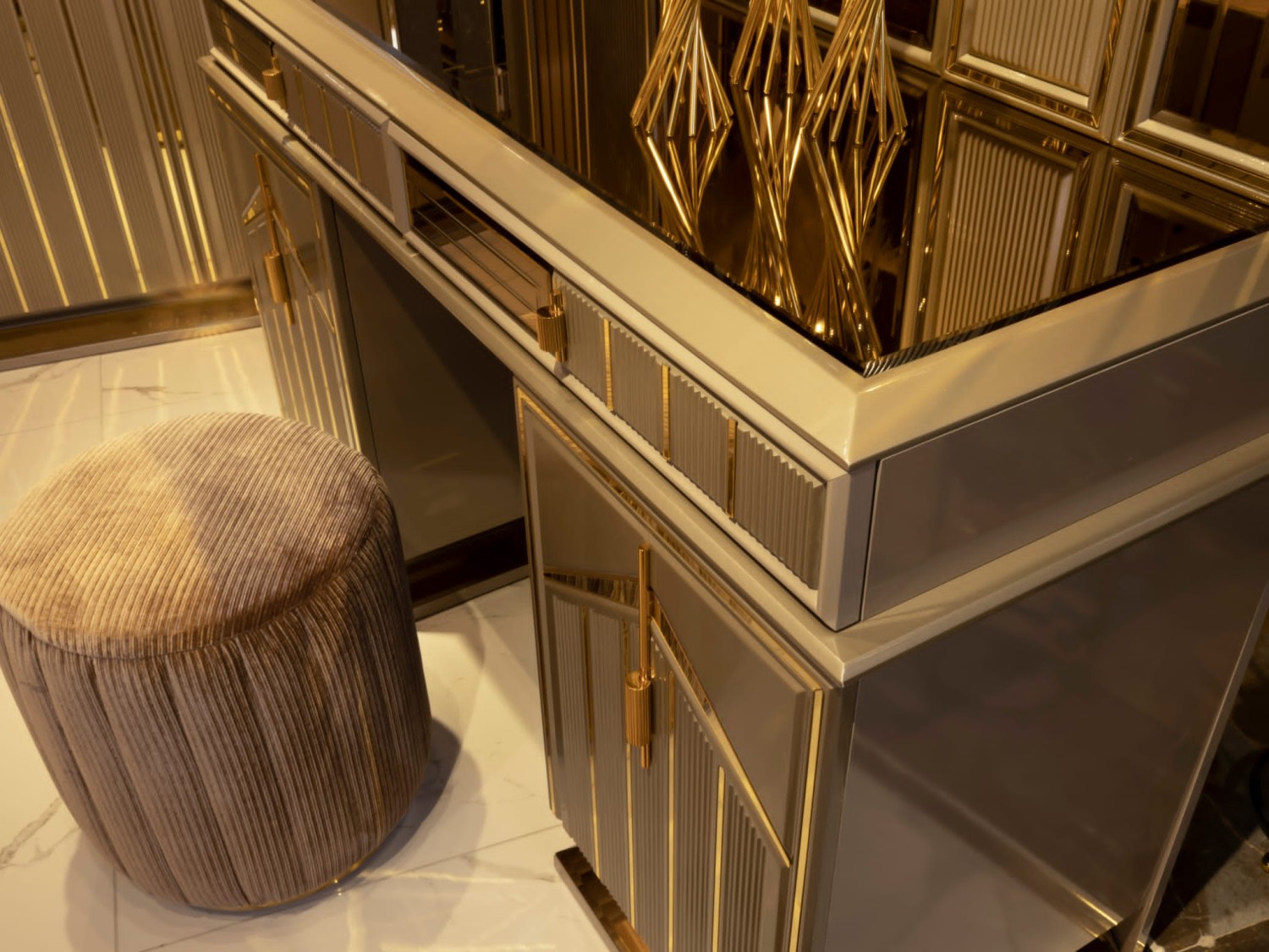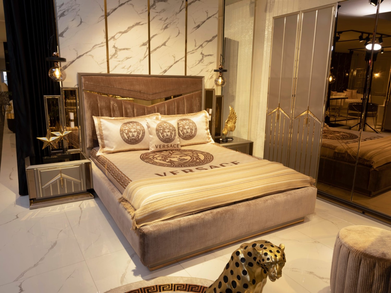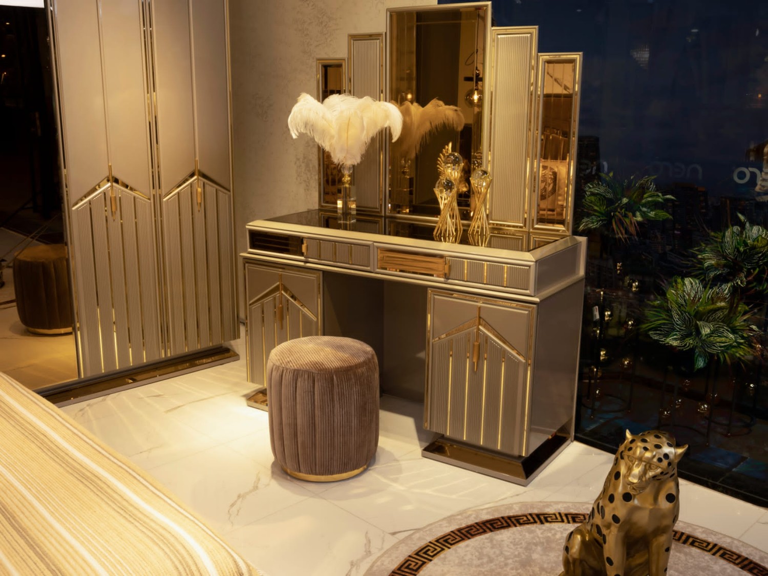 Роскошный спальный гарнитур в современном стиле с элементами арт-деко. В комплект входит просторная кровать с высоким мягким изголовьем, выполненным из бархатной ткани с декоративными золотыми вставками, прикроватные тумбы с геометрическим декором, вместительный шкаф с зеркальными фасадами и позолоченными акцентами, а также элегантный туалетный столик с пуфом.