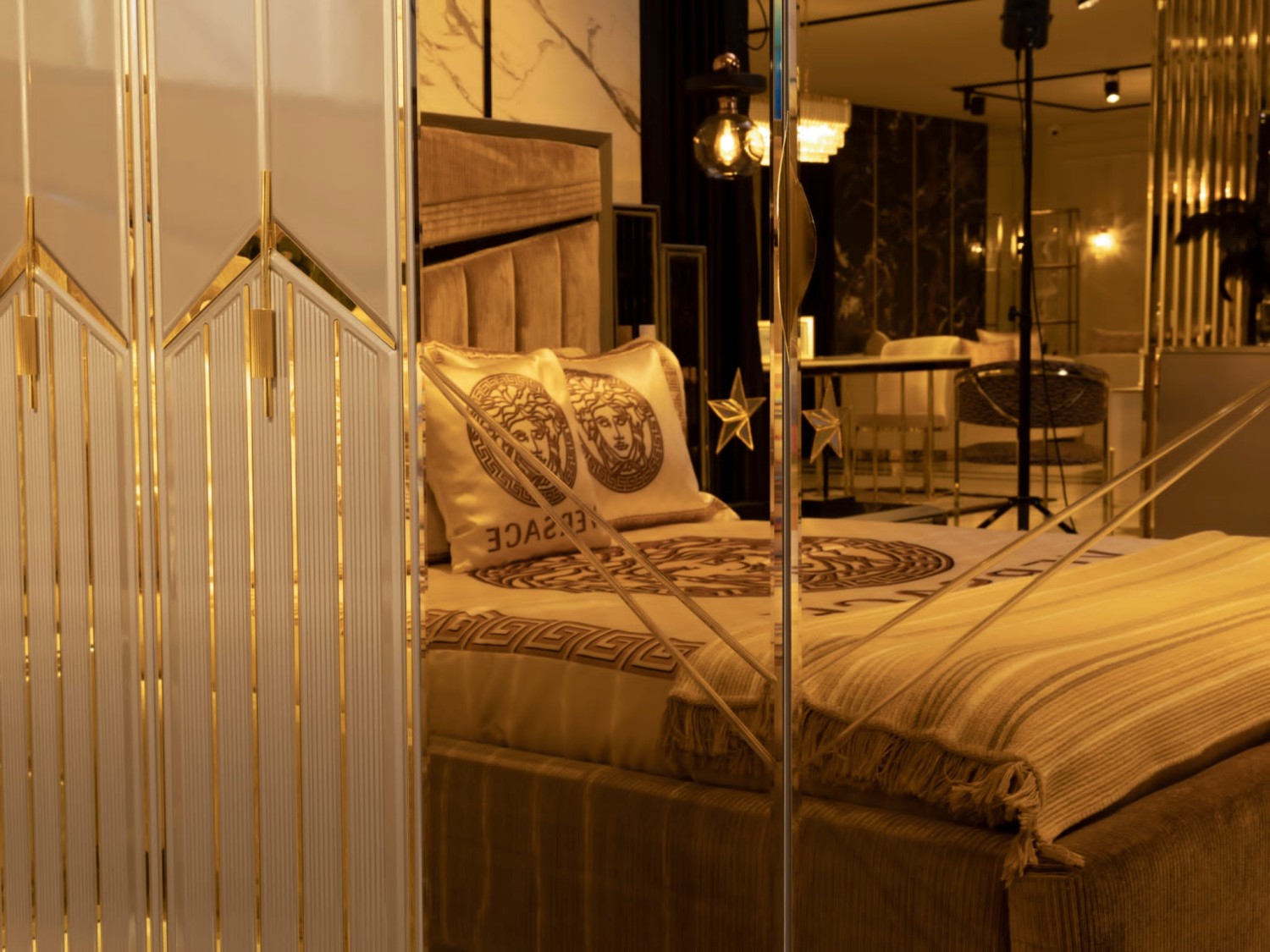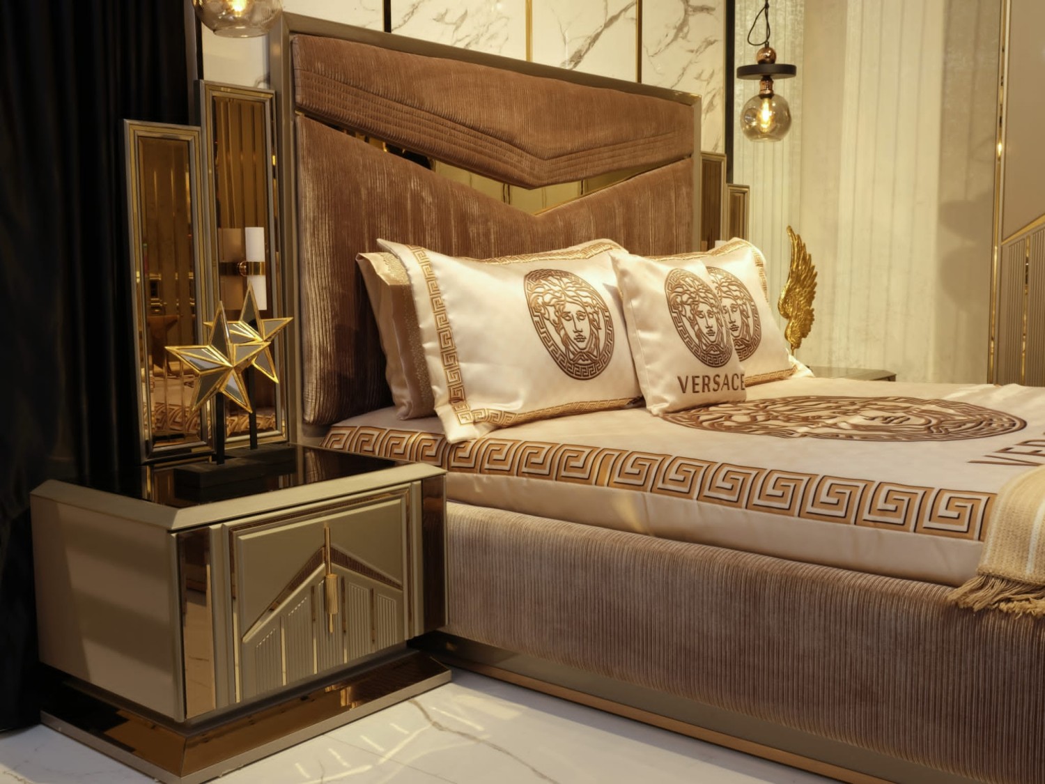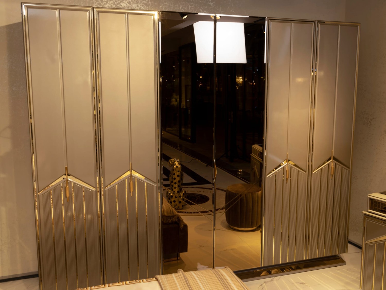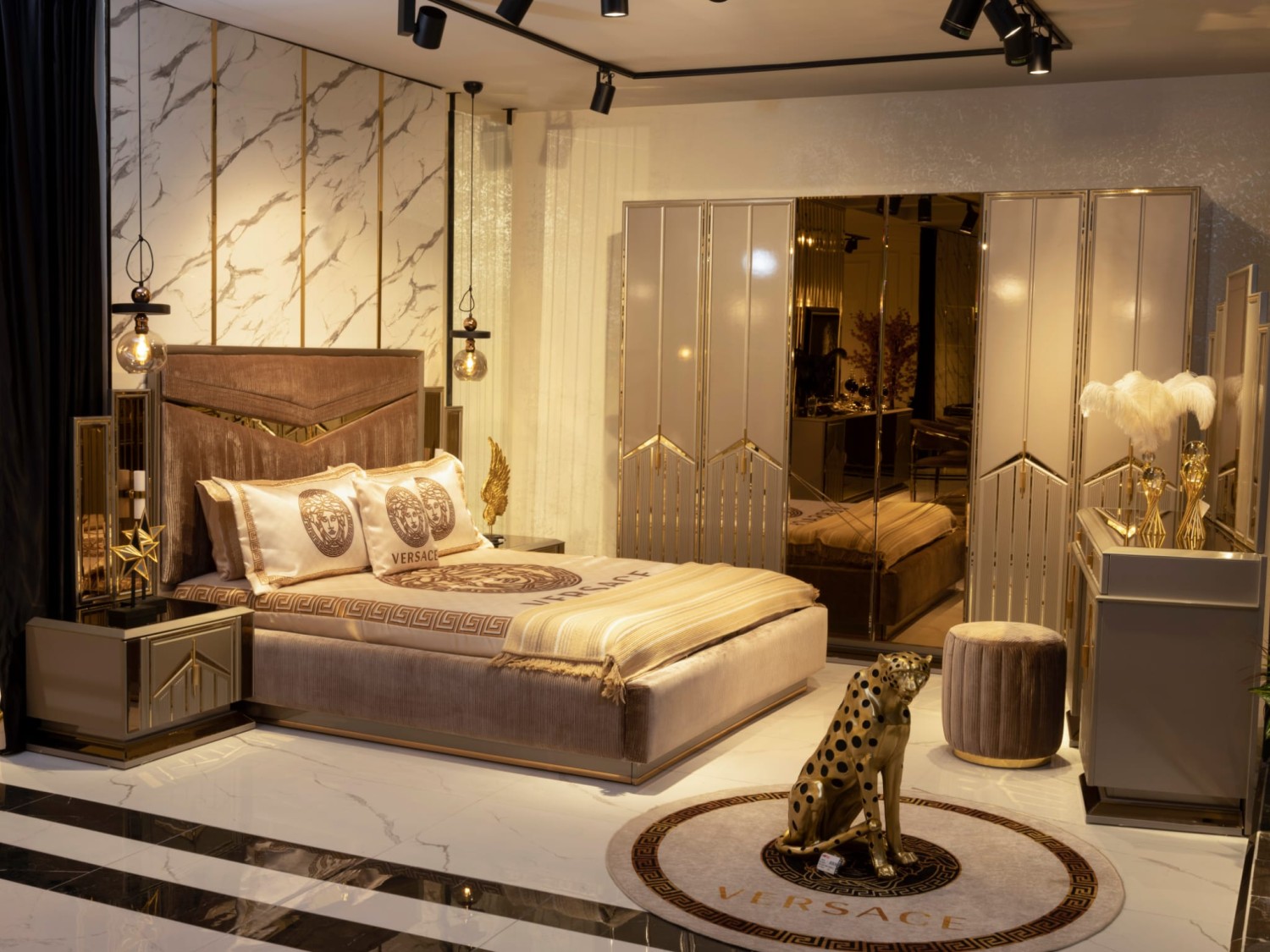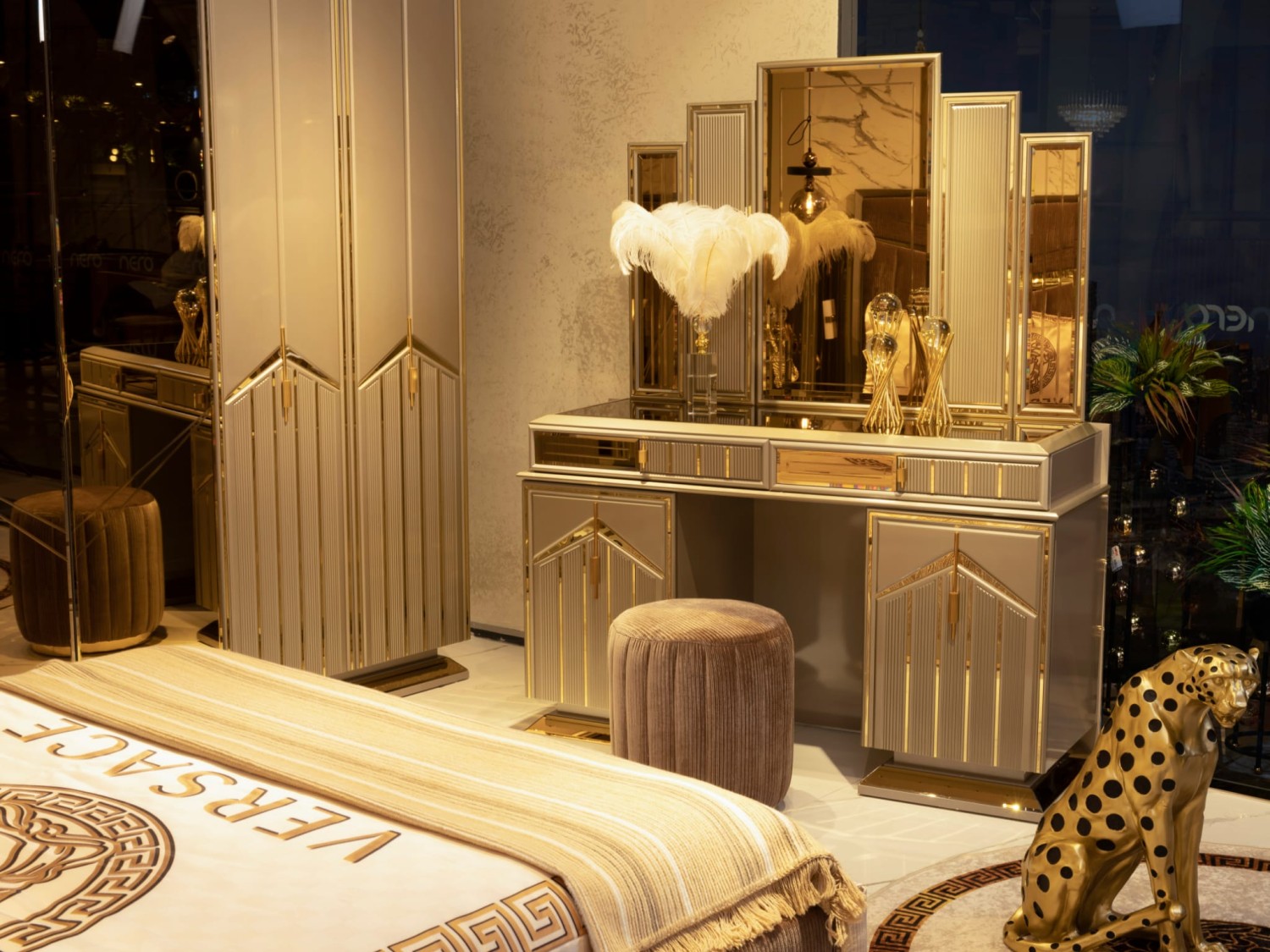 Роскошный спальный гарнитур в современном стиле с элементами арт-деко. В комплект входит просторная кровать с высоким мягким изголовьем, выполненным из бархатной ткани с декоративными золотыми вставками, прикроватные тумбы с геометрическим декором, вместительный шкаф с зеркальными фасадами и позолоченными акцентами, а также элегантный туалетный столик с пуфом.