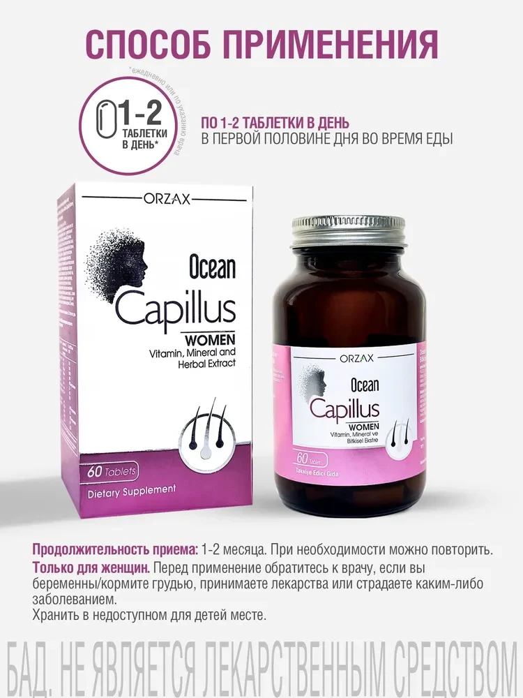 Комплекс витаминов для роста волос ORZAX OCEAN CAPILLUS WOMEN 60 таблеток разработан специально для женщин и является эффективным решением для стимуляции роста и укрепления волос. Эта добавка помогает улучшить состояние волос и предотвращает их выпадение. Формула содержит тщательно подобранный комплекс витаминов и минералов, необходимых для оптимального роста, и разработана с учетом высокой усвояемости организмом.