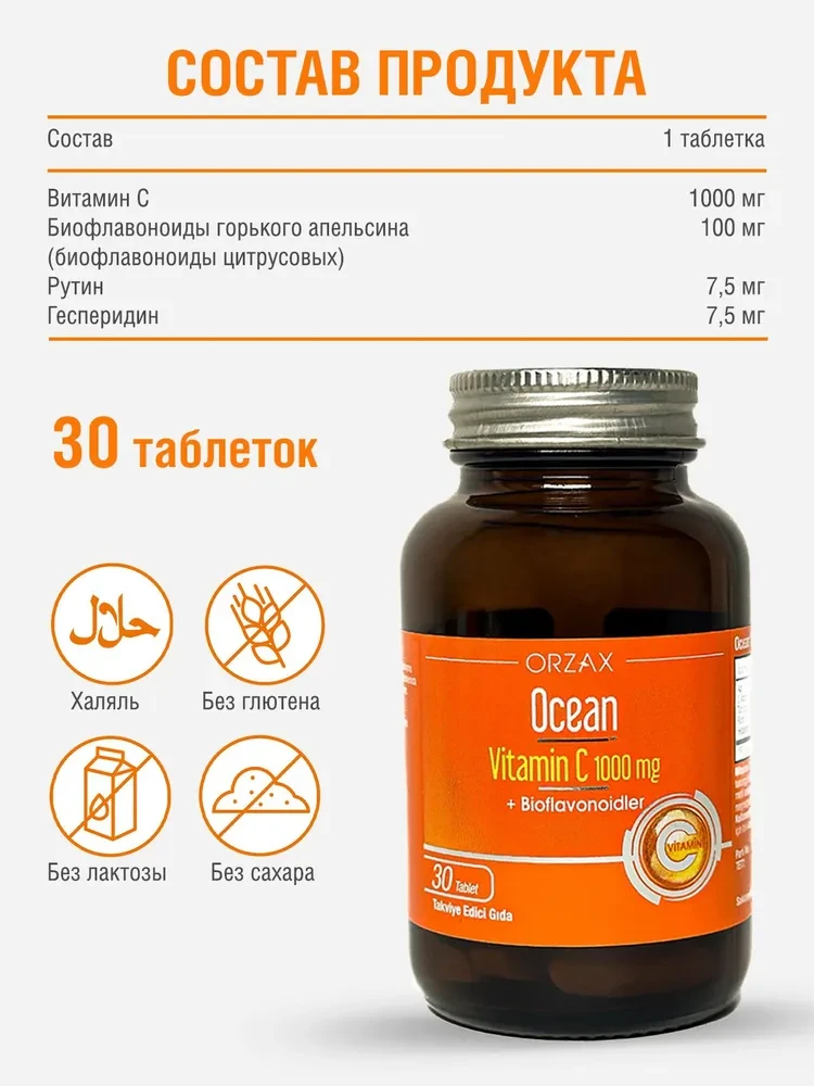 | Состав | Витамин C 1000 мг; биофлавоноиды цитрусовых 100 мг; рутин 7,5 мг; гесперидин 7,5 мг |