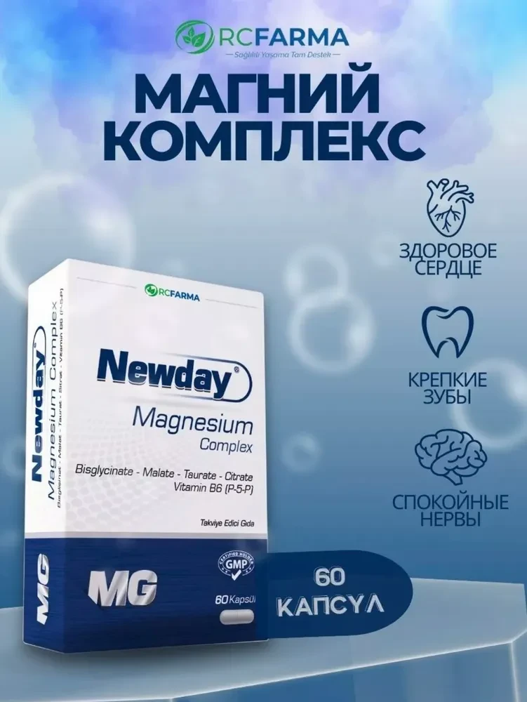 Newday Magnesium Complex - это комплексный продукт, который содержит несколько форм магния, таких как магниев глицинат, магниев малат, магниев таурат и магниев цитрат, а также витамин B6. Этот продукт разработан для поддержки здоровья сердца, нервной системы и мышц.Некоторые ключевые свойства Newday Magnesium Complex:Обеспечивает поддержку здоровья костей и мышц: магний помогает в поддержании здоровья костей и мышц, а также участвует в синтезе белков и ДНК.Помогает в управлении стрессом и тревогой: магний помогает в снижении уровня стресса и тревоги, улучшает настроение и способствует более качественному сну.Поддерживает здоровье сердца: магний является важным элементом для поддержки здоровья сердца и сосудов, он может снижать уровень холестерина в крови, улучшать кровоток и регулировать сердечный ритм.Помогает в борьбе с синдромом раздраженного кишечника (СРК): магний может помочь в снижении симптомов СРК, таких как боли в животе, запоры и диарея.Легко усваивается: различные формы магния, содержащиеся в Newday Magnesium Complex, легко усваиваются организмом и обеспечивают максимальную эффективность