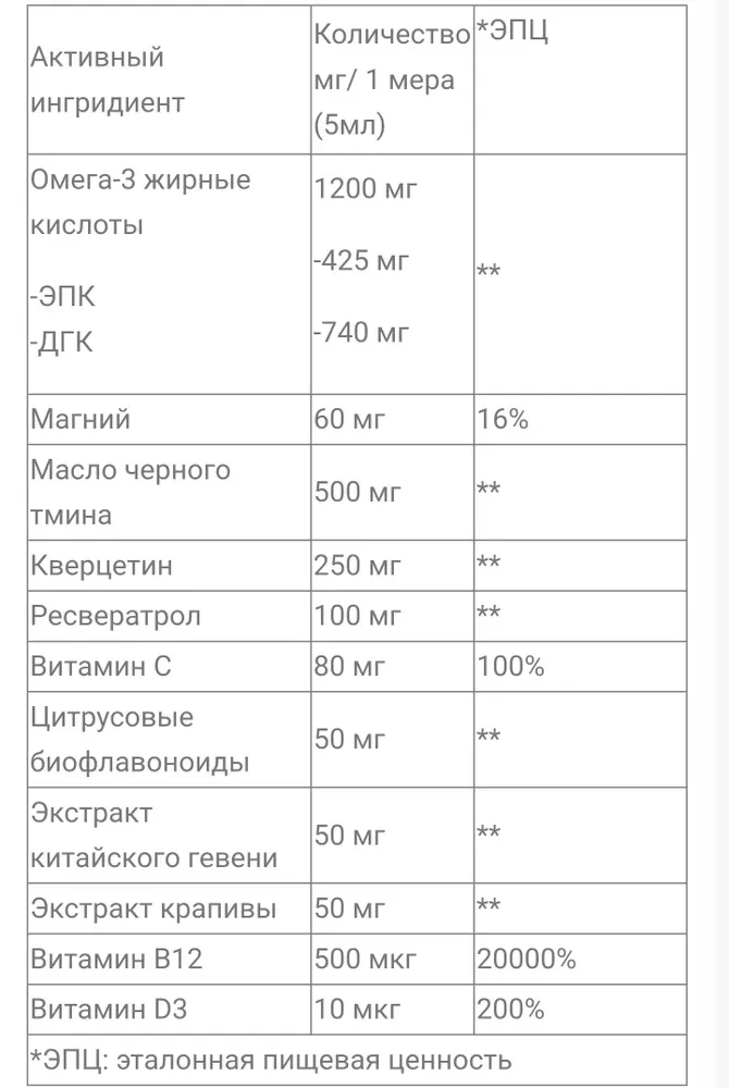 Важная информация: не содержит потенциальных аллергенов, таких как сахар, соль, крахмал, дрожжи, соя, кукуруза, глютен и молочные продукты. Синтетические консерванты и подсластители не использовались. Подходит для вегетарианцев. * Постановление об использовании декларации о состоянии здоровья в пищевых продуктах и пищевых добавках (официальный вестник № 32169 от 20.04.2023 г.) Рекомендация по применению: взрослым и детям в возрасте от 11 лет и старше рекомендуется употреблять по 1 мере (5 мл) в день. Предупреждения: не превышайте рекомендуемую суточную дозу. Пищевые добавки не могут заменить обычное питание. Храните в недоступном для детей месте. ЭТО НЕ ЛЕКАРСТВО.