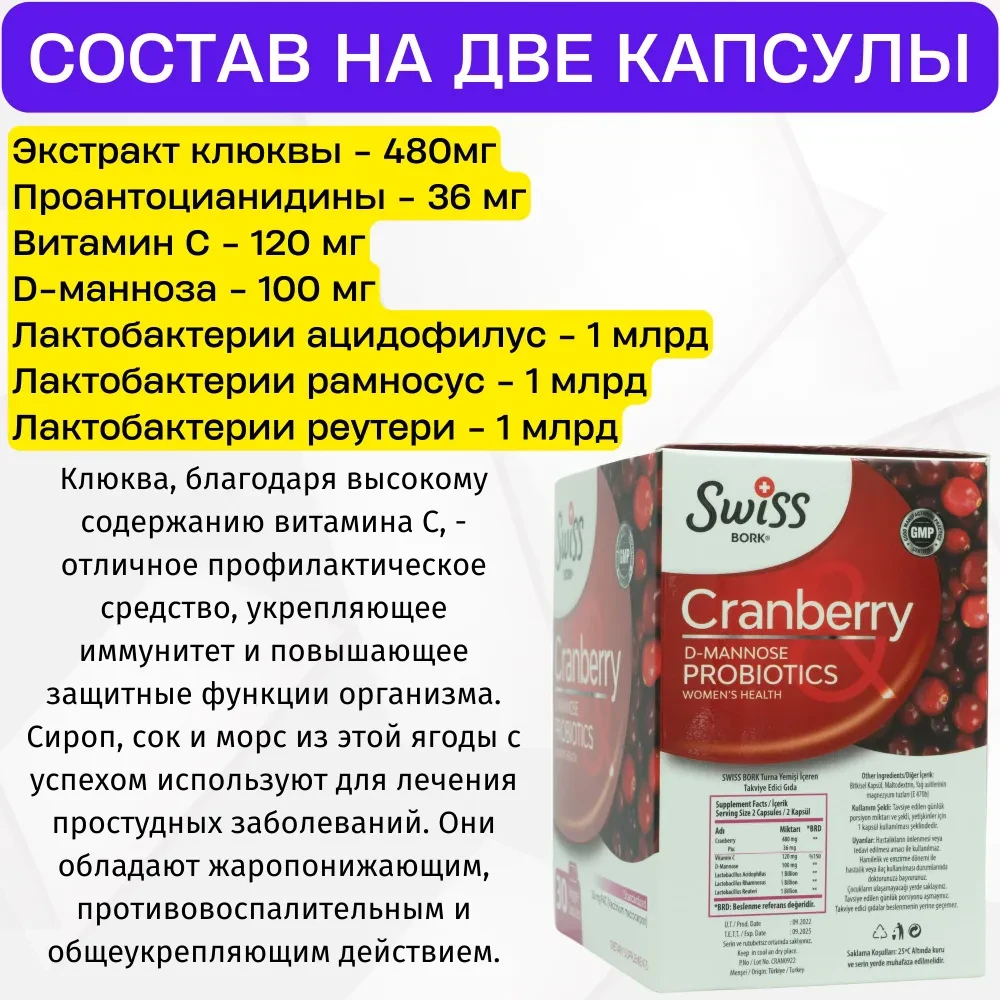 Swiss Bork Cranberry Probiotics Частые болезни, прием антибиотиков, стрессы, переедание и другие стресс-факторы оказывают существенное влияние на организм. Одним из уязвимых участков выступает желудочно-кишечный тракт, где происходит нарушение нормальной микрофлоры. Как результат — появление запора или диареи, проблемы с пищеварением и т.д. Со временем микрофлора восстанавливается самостоятельно, однако это сопровождается неприятными ощущениями и иными неприятностями. Быстрому восстановлению микрофлоры можно поспособствовать принимая биодобавку Swiss Bork Cranberry Probiotics. Описание Особенности биодобавки Swiss Bork Cranberry Probiotics В состав добавки Swiss Bork Cranberry Probiotics входит ряд полезных компонентов, которые способствуют быстрому восстановлению организма: Ацидофильные лактобактерии. Отвечают за укрепление иммунитета, способствуют улучшению синтезу витаминов группы B и K. Способствуют лучшему усвоению молочной продукции, обеспечивая расщепление лактозы и эффективному усвоению кальция. Лактобактерии рамнозус. Это представители естественной флоры кишечника. Восстановление ее количества позволяет облегчить симптомы СРК, способствуют облегчению диареи, укреплению общего здоровья кишечника. Витамин C. Позволяет укрепить иммунитет, а также создает защиту от влияния вирусов и бактерий. Способствует синтезу ряда гормонов, позволяет нормализовать проницаемость капилляров, задействован в синтезе коллагена. Клюква. Содержит большое количество витамина C, что делает ее эффективным профилактическим средством, способствует укреплению иммунитета. Добавка предназначена исключительно для приема взрослыми — от 18 лет. Суточная дозировка — одна капсула, которую необходимо запить небольшим количеством воды. Открытую упаковку необходимо хранить в прохладном, темном месте, недоступном для детей. Товар не является лекарственных средством.