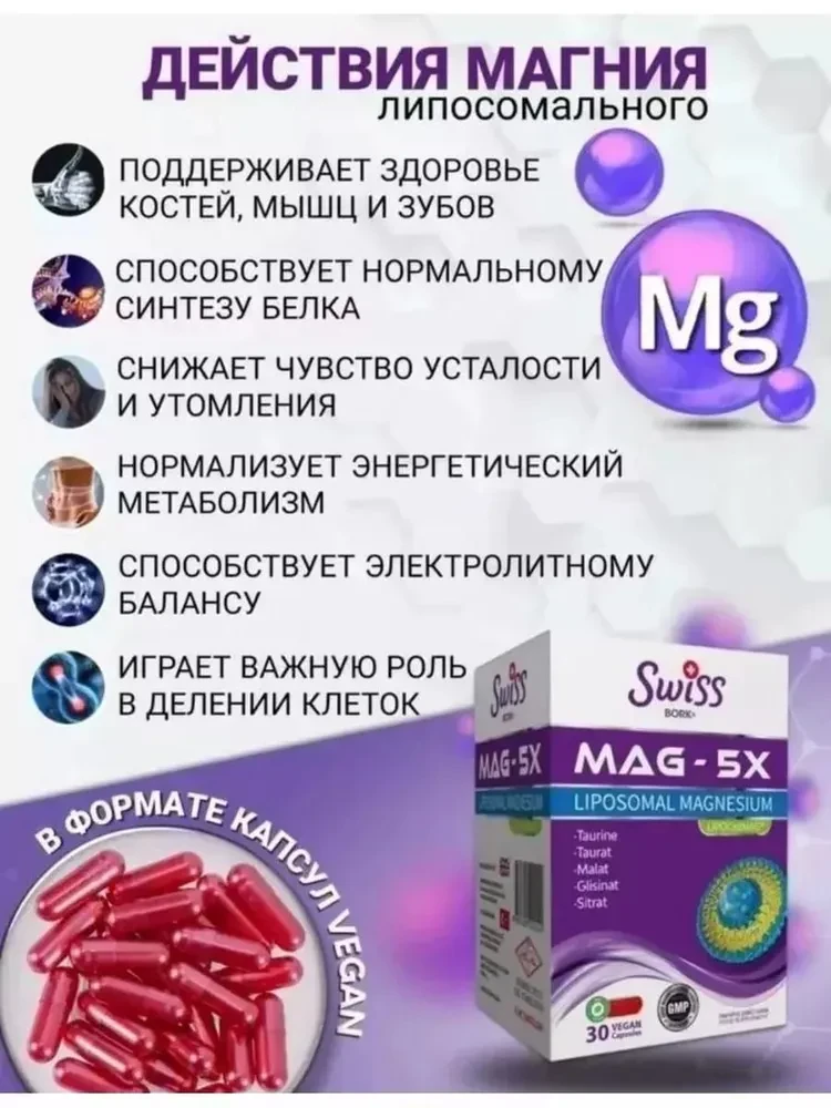 Mag-5x liposomal magnesium,Магний является природным транквилизатором и антистрессовым минералом. Магний турецкий ; Магний липосомальный ; Магний цитрат ; Магний бисглицинат; Магний малат; Регулярный прием микроэлемента способствует улучшению эмоционального фона. Обеспечивает передачу нервно-мышечных импульсов. Липосомальный магний оказывает седативное и метаболическое действие, нормализует электрическую активность клеток ЦНС и передачу нервного импульса. Снимает мышечное напряжение. Магний отвечает за нормальное сокращение и расслабление мышечных волокон. При дефиците магния в мышцах образуется избыток кальция и натрия, возникают мышечные спазмы. Магний отвечает за стабильный сердечный ритм и артериальное давление. При недостатке магния снижается тонус сердечной мышцы, сердце не может правильно перекачивать кровь.Также магний влияет на тонус стенок кровеносных сосудов, тем самым поддерживает нормальное артериальное давление. В организме человекаМагний выполняет такие функции: повышает стрессоустойчивость помогает нервной системе справляться с различными стресс-факторами защищает нервную систему от перевозбуждения Способ применения: Рекомендуемое суточное количество и форма порции - 1 капсула для взрослых. НЕ ЯВЛЯЕТСЯ ЛЕКАРСТВЕННЫМ СРЕДСТВОМ!
