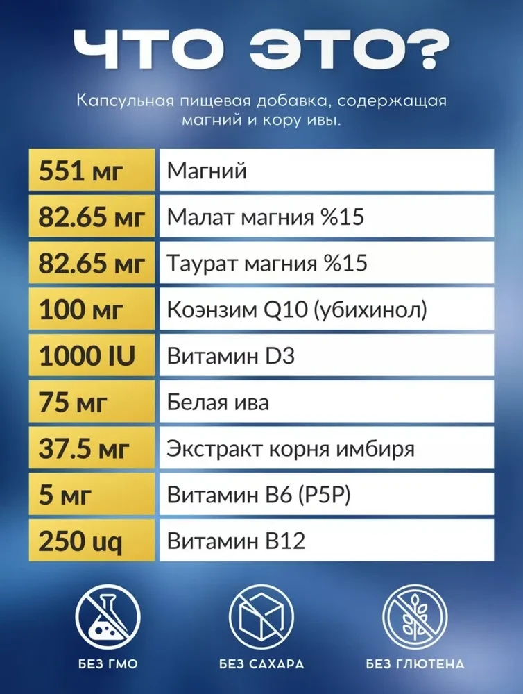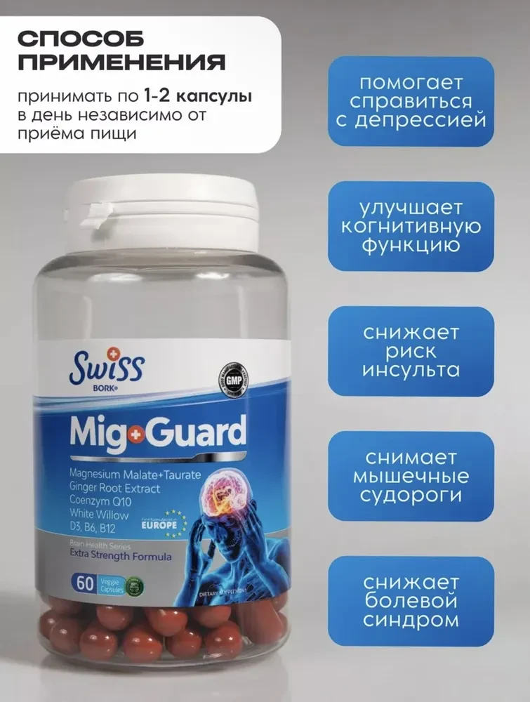 Mig Guard от Swiss - это революционная пищевая добавка, созданная для поддержания оптимального здоровья мозга и жизненной силы. Эта мощная формула сочетает в себе уникальную смесь необходимых питательных веществ, включая малат магния, таурат магния, коэнзим Q10 (убихинон), витамин D3, экстракт белой ивы, корня имбиря, витамин B6 (P5P) и витамин B12 (аденозилкобаламин). Вместе эти ингредиенты действуют синергетически, поддерживая когнитивные функции, ясность ума и общее самочувствие.Mig Guard предназначен для людей, стремящихся поддержать свое когнитивное благополучие и общее функционирование мозга. Рекомендуется придерживаться рекомендованной производителем дозировки. Как и в случае с любой пищевой добавкой, если у вас уже есть какие-либо заболевания или вы принимаете лекарства, проконсультируйтесь с медицинским работником, прежде чем включать Mig Guard в свой распорядок дня.